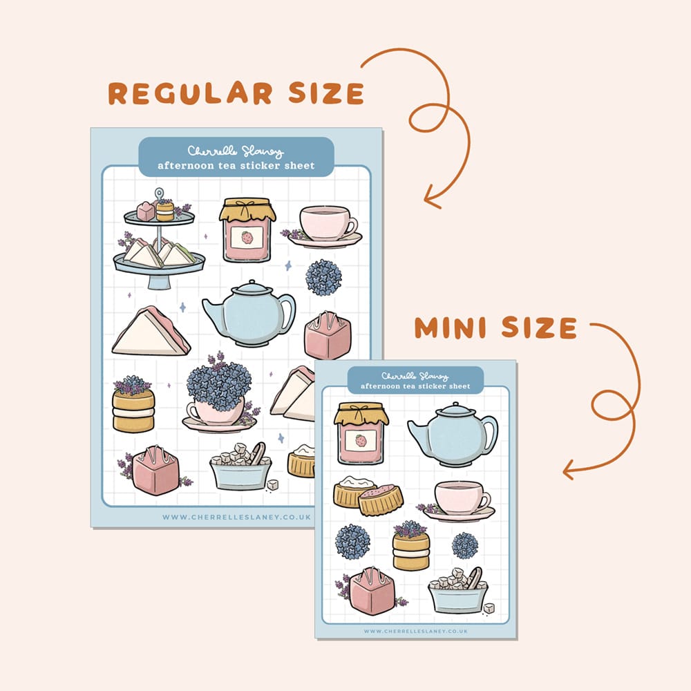 Feeling something sweet? This Afternoon Tea sticker sheet is steeped in charm, featuring dainty sandwiches, decadent cakes, and lavender and hydrangea florals for that perfect garden-party vibe. Ideal for jazzing up journals, scrapbooks or a note to your tea-loving pen pal. It’s a brew-tiful way to add a spot of whimsy! • Gloss Waterproof Stickers • Sheet size: – Regular: approx 12 x 16 cm – Mini: approx 8 x 11 cm