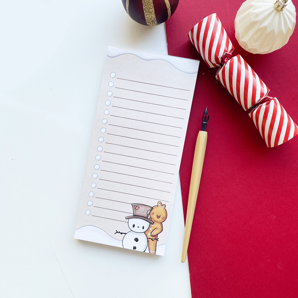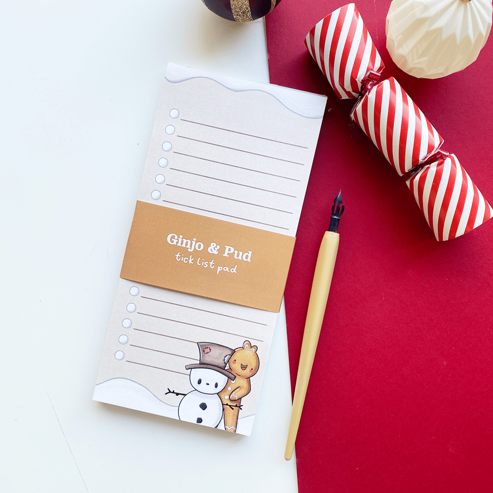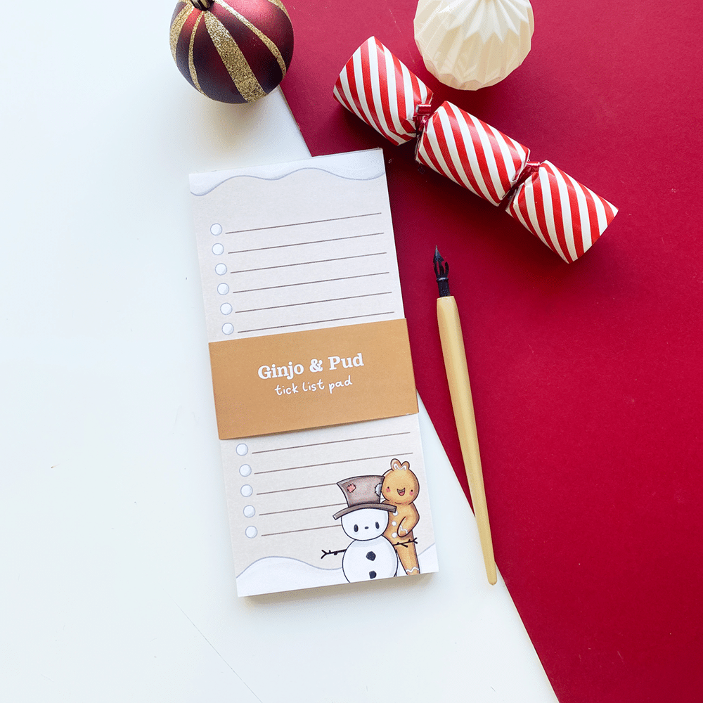 Add a dash of chaos and charm to your notes with a Ginjo & Pud List Notepad! 🍪🎄 Each page features Ginjo’s and Pud’s lovable presence, bringing a little personality to every list, doodle, or reminder. Perfect for jotting down thoughts, plans, or spontaneous adventures — because the festive season is always better with Ginjo and Pud by your side. ✨