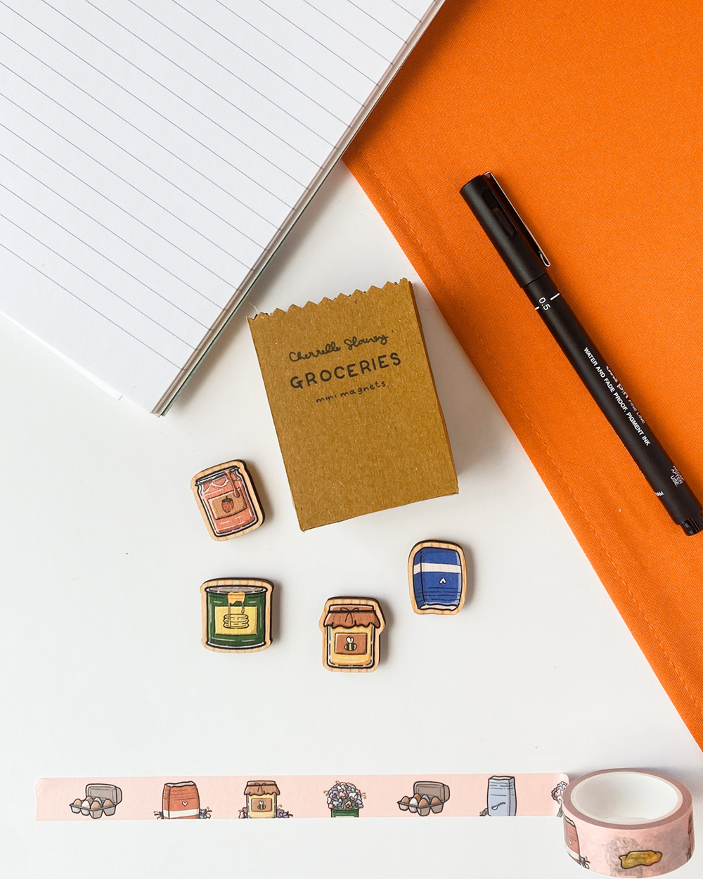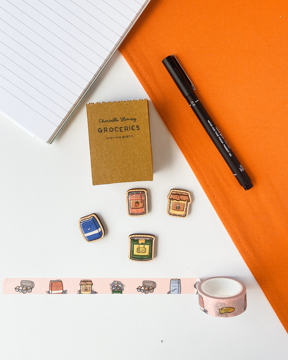 Bring a little kitchen magic to your space with the Groceries Mini Magnet Set! 👻🧺 This adorable set includes four tiny magnets – a bag of flour, a tin of syrup, some jam, and a jar of honey – ready to head into Heidi the Ghost’s pantry shelves. They come tucked inside a handcrafted cardboard grocery bag that doubles as the sweetest little display piece for your shelf or desk. 🍯✨