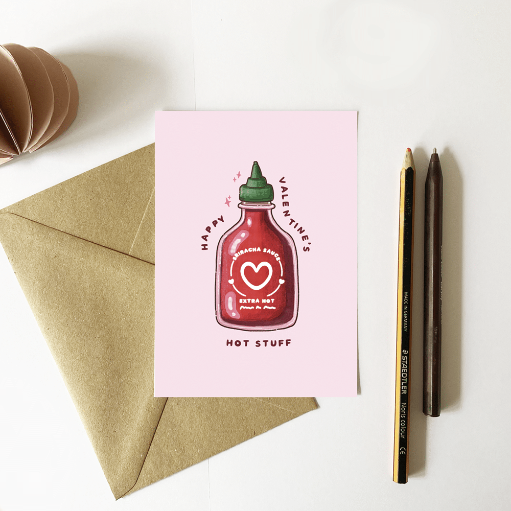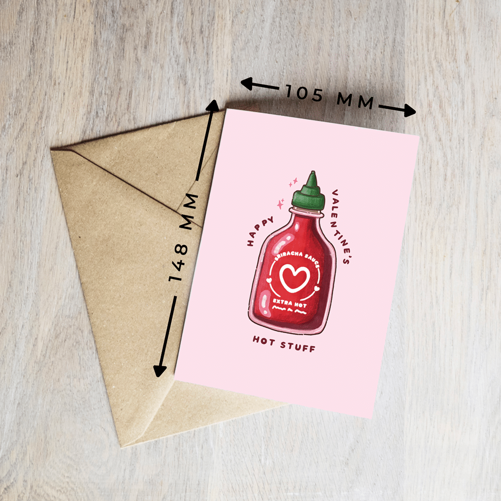 Roses are red, violets are blue, sriracha sauce is not as hot as you… or whatever the poem is ❤️ 🌶️ Whether boyfriend, girlfriend, husband, wife, partner or spouse – let them know you love them with this saucy little card 😜 • Hot Stuff Greeting Card – Ideal for Valentine’s or Anniversary • Approx 10 x 15 cm • Supplied with Brown Kraft Envelope