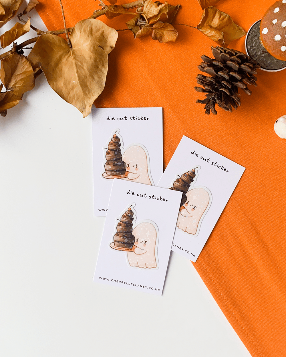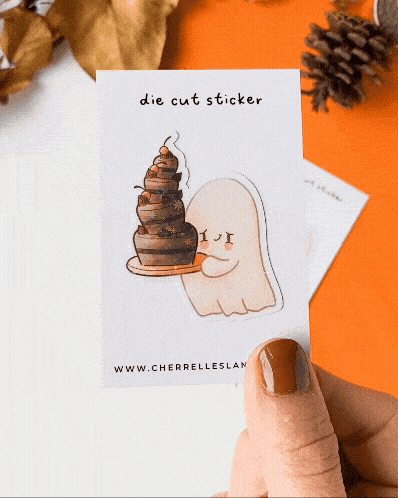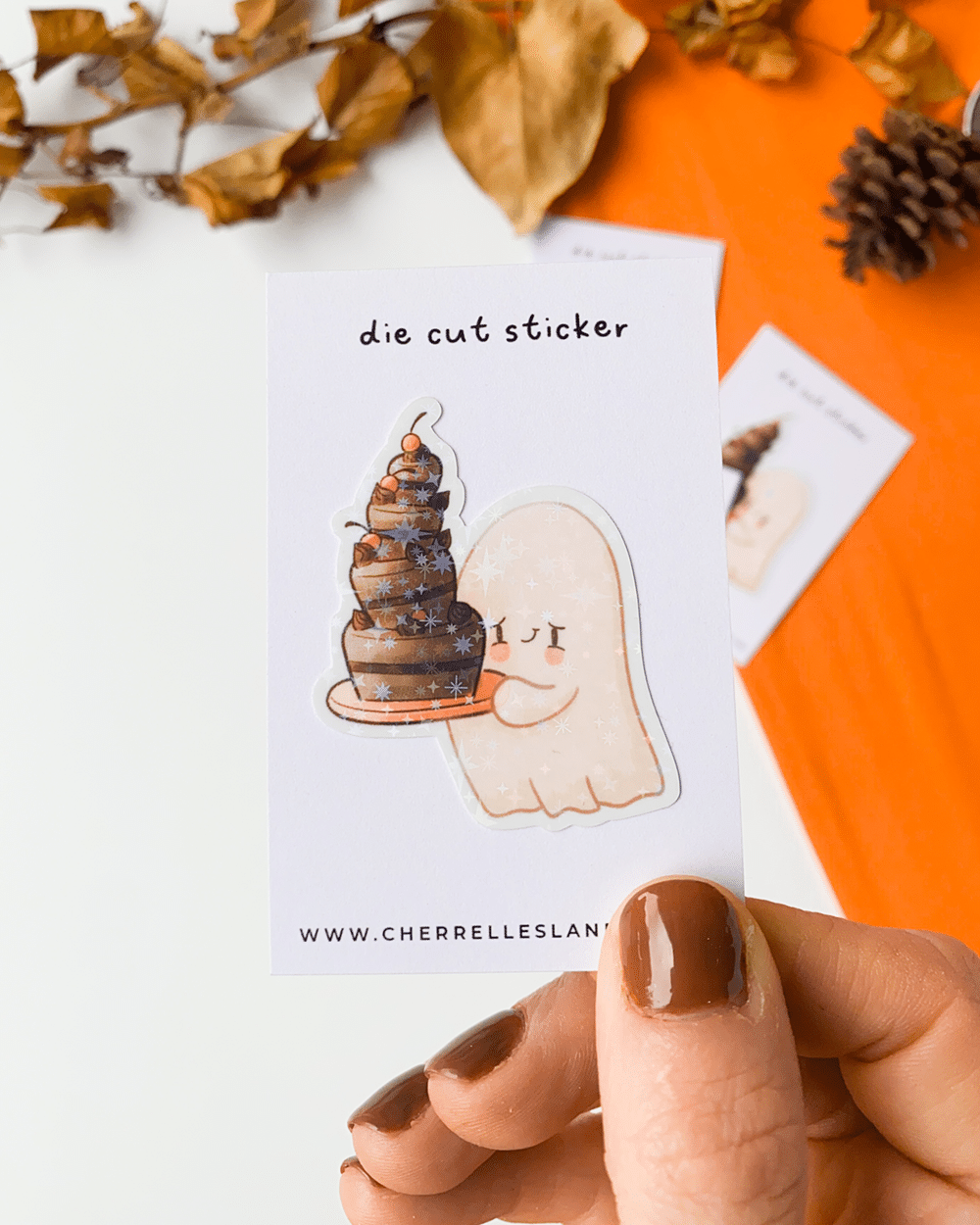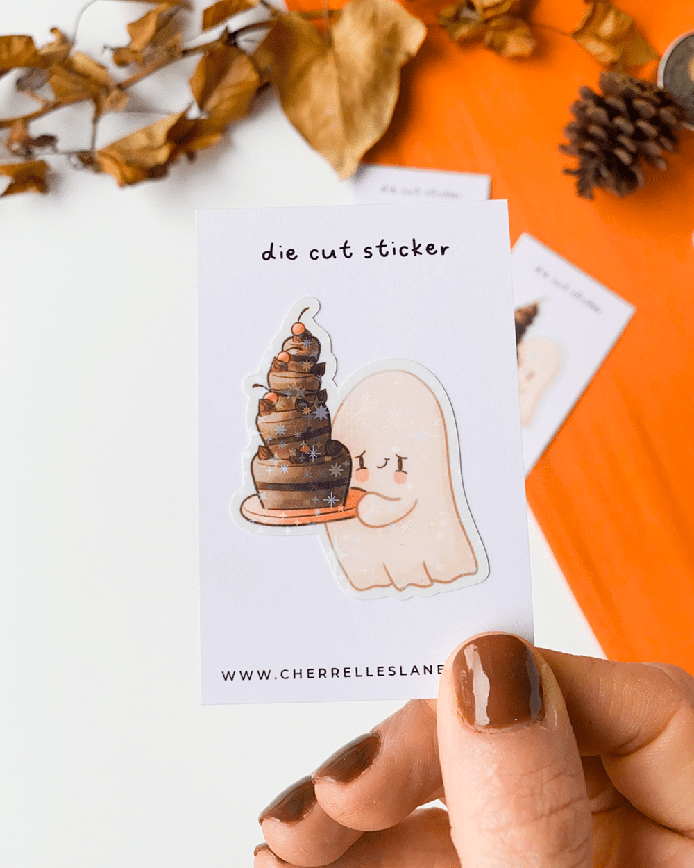 Meet Heidi the Ghost, floating by with a boo-tifully oversized chocolate cake that’s almost bigger than she is! 🍰👻 This waterproof, holographic die-cut sticker is perfect for adding a little sparkle (and sugar rush) to your laptop, notebook, or water bottle. She’s proof that you can have your cake and haunt it too! ✨