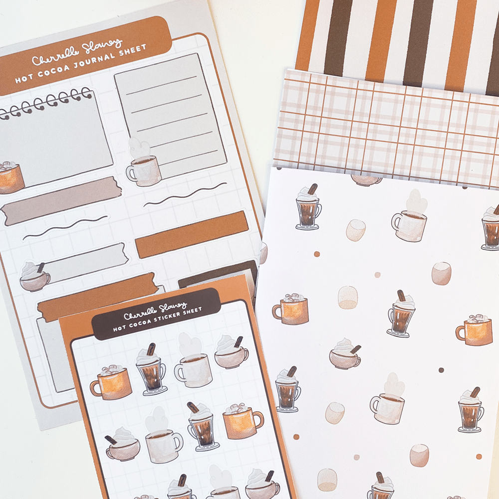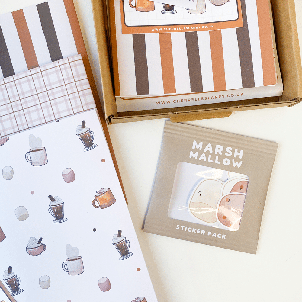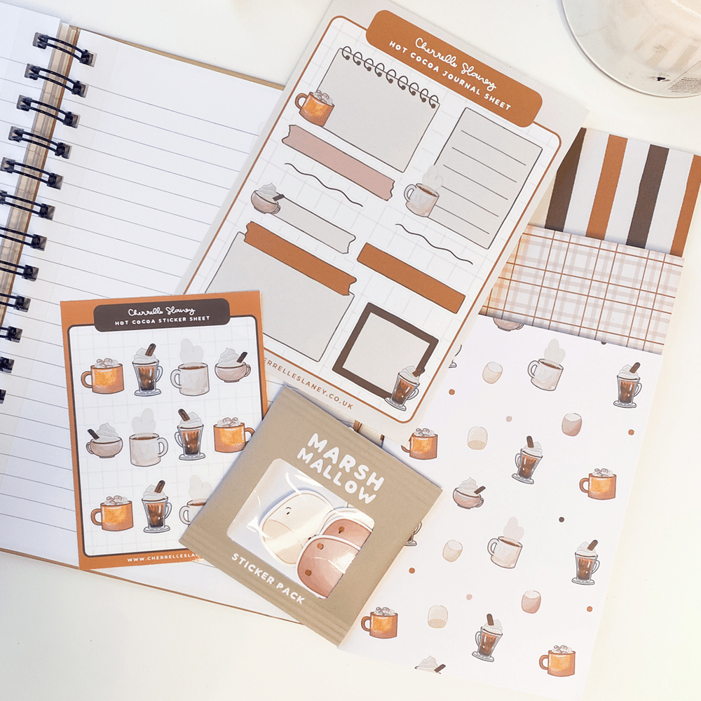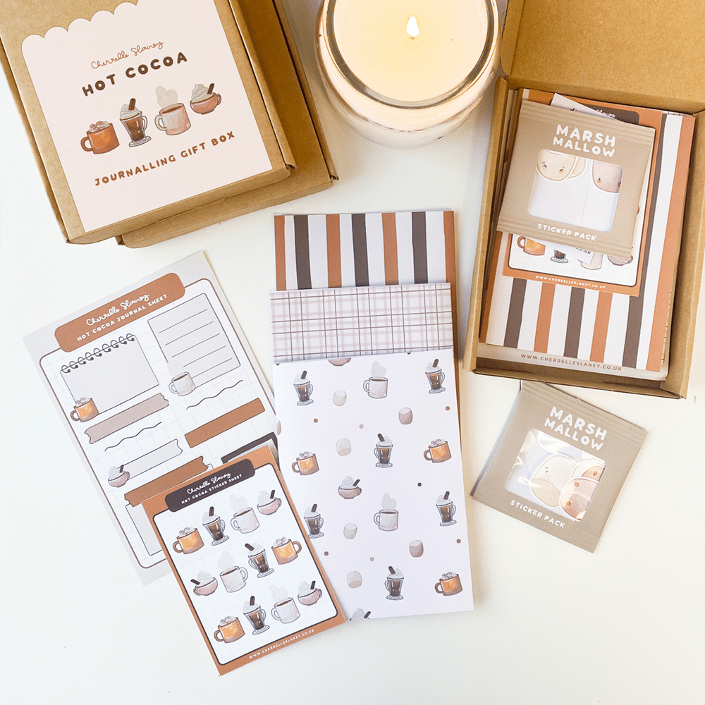 Stir up something sweet in your winter journal spread with this cute and cosy hot cocoa journal gift box ☕️ 🍫 This kit contains sticker sheets, scrapbooking papers and a sticker pack, all with a hot chocolate theme – perfect for crafting up some Christmas magic this season 🎄 ❄️ Whether you use it in your junk journal, scrapbook or somewhere else, these supplies are sure to give you the warm and fuzzies 🕯️ 🥰 Includes: 1x Mini Sticker Sheet, 1x Sticker Sheet, 1x Sticker Pack & 3x Scrapbooking Papers